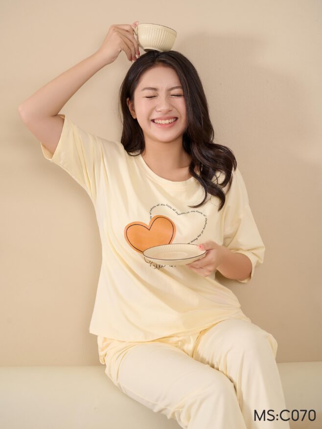 Bộ ngủ mặc ở nhà chất liệu cotton tay lửng quần dài họa tiết trái tim C070