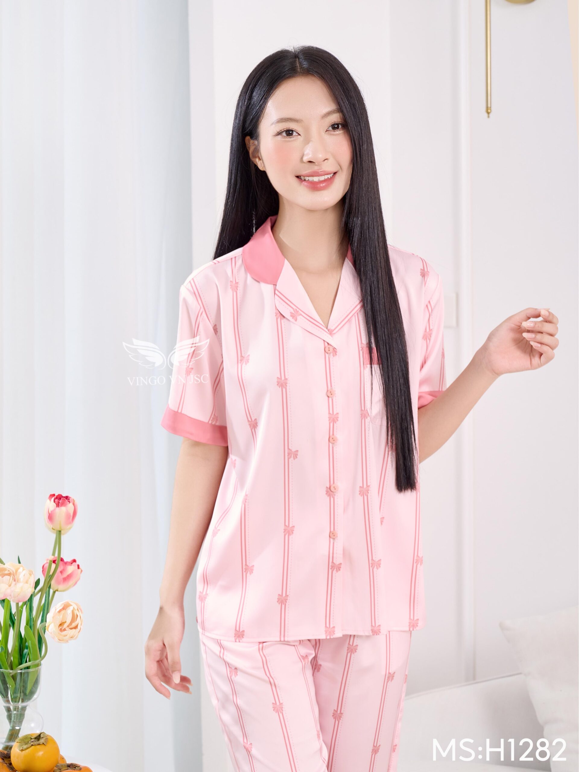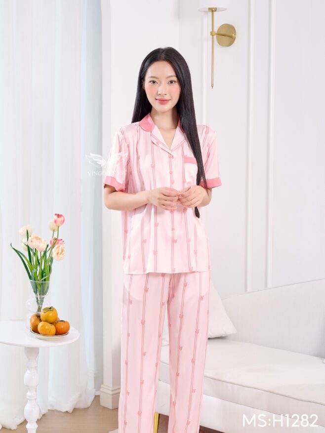 - Tên sản phẩm: Bộ pijama lụa nữ cao cấp dáng suông tay ngắn quần màu hồng xinh xắn H1282